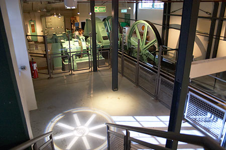 At the Wellington Cable Car Museum, the lower storey room containing the winding gear has been made safe for visitors. The image of a rotating wheel is projected onto the floor at the bottom of the stairs, perhaps to induce people to walk down and see the works.