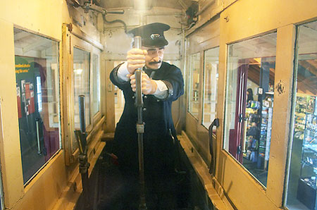 This chap is showing how to drive a cable tram. In the middle of the gripper car is this narrow windowed space, equipped with two big levers and a big handwheel for controlling the tram. On each side of the driver's compartment are open seats for passengers. Behind and in front are enclosed passenger compartments. I took this picture through the glass division between the compartments.
