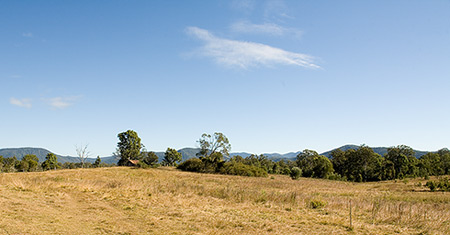 The hut in the landscape, looking west towards Mount Nebo and Mount Glorious.